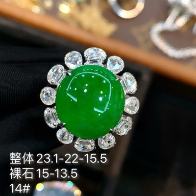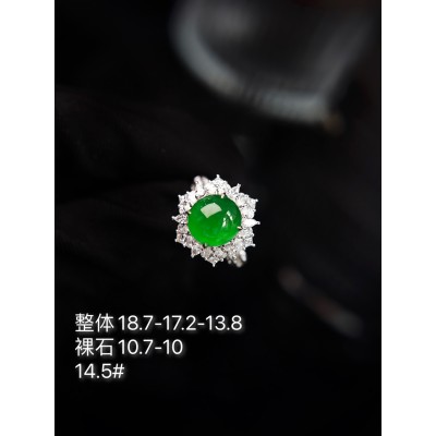 翡翠戒指,滿綠蛋面戒指,大鑽鑲嵌,整體:23.1-22.15.5,裸石:15.0-13.5
